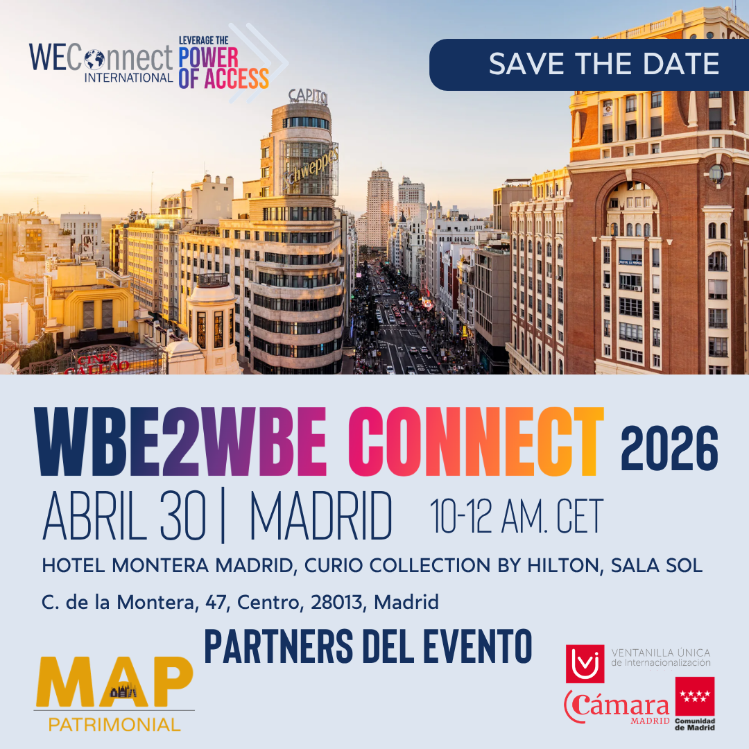 We invite you to an exclusive WBE2WBE Connect event, designed to foster meaningful connections, collaboration and business opportunities among women-owned businesses in Spain. This event will bring together our WBEs in a dynamic setting where they can exchange ideas, explore synergies and strengthen their professional network. This event is made possible thanks to the sponsorship of our WBE Mónica Paladines Herrera, CEO of MAP Patrimonial. And as always, thanks to the support of the VUI (Ventanilla Única de Internacionalización).